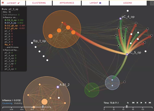 其次,Forbes教授还介绍了另一个与生物学家合作开发的分析蛋白质间动态相互作用的Kappa系统。Kappa系统通过将作用的规则设置为节点简化网络结构并实现交互性探索,如图2所示,图中的每个节点对应一个具体作用机制,节点之间的边表示某个机制的触发对另一个机制的激励或抑制作用。通过该项目,Forbes教授进一步阐释了如何与领域专家合作,并通过交互技术帮助他们理解复杂的动态数据。
