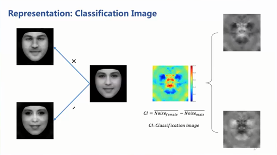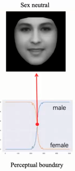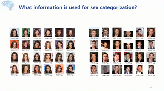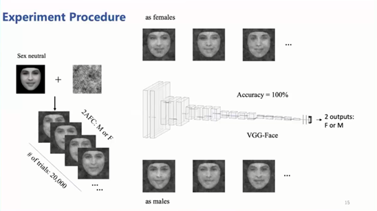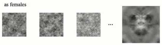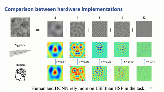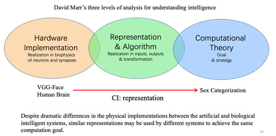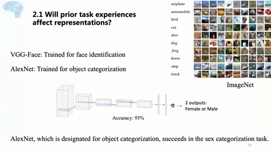 首先,我们来验证第一个可能性:共同的任务经验。这里,我们选择AlexNet。AlexNet也是预训练网络,它不做面孔识别而做物体分类,我们把最后一层微调,让它做识别男性和女性的分类任务,正确率93%。即,虽然AlexNet是用来训练物体分类的,但是也能够把男性和女性区分,正确率也相当高。现在问一个有趣的问题,AlexNet在性别辨认上也能达到和人一样的准确度,但是AlexNet用的是和人类似的表征吗?我们来看AlexNet辨别男性和女性的特征图,如下图所示,肉眼能够辨别两者存在非常大差别,基本不相关,相关度等于-0.04。我们把它叠加到原来的基底图上去,得到的人脸也没有明显的性别特征。所以从这个角度来讲,我们发现AlexNet虽然能够区分男性和女性,但是它所用的表征是完全不一样的。我们做进一步的空间频率分析,把噪音特征图分为不同的空间频率,可以看到,基本上AlexNet和人类的各频率的噪音特征图是不相关的。回到实验的第一部分结论,我们发现预训练任务非常重要。为什么VGG-Face和人类在区分男性女性时用的表征是相似的?因为它们都被训练在个体层面上进行加工,而AlexNet是在类的层面上进行加工,从这个角度来讲,导致它们使用呢不同的表征。这一点我们可以从进化的角度来理解。我们之所以从单细胞变成现在多细胞的动物,就是因为我们在不断地完成大自然交给我们的任务;一旦完成不了,那只有一个结果,就是基因被淘汰。也就是说,we are what we do。我们的智能是被我们过去所完成的任务所决定的。
