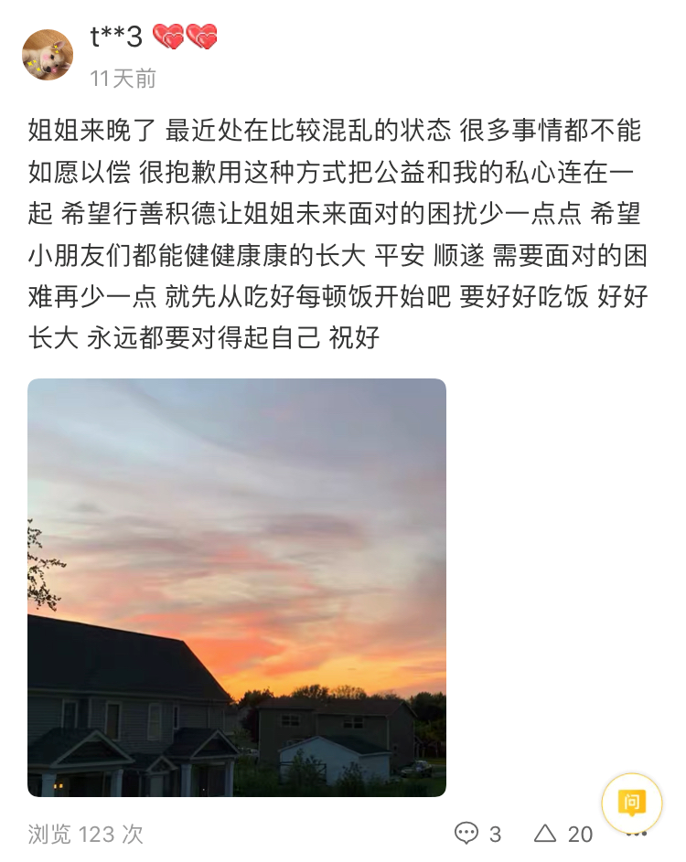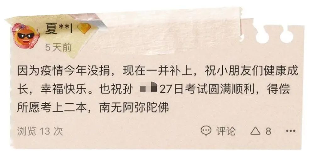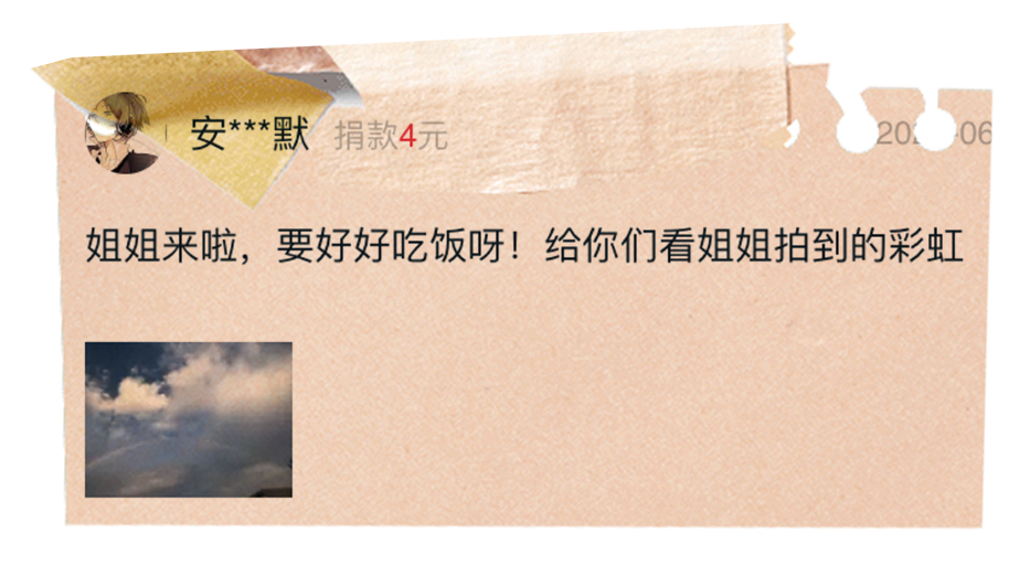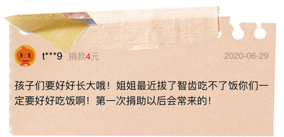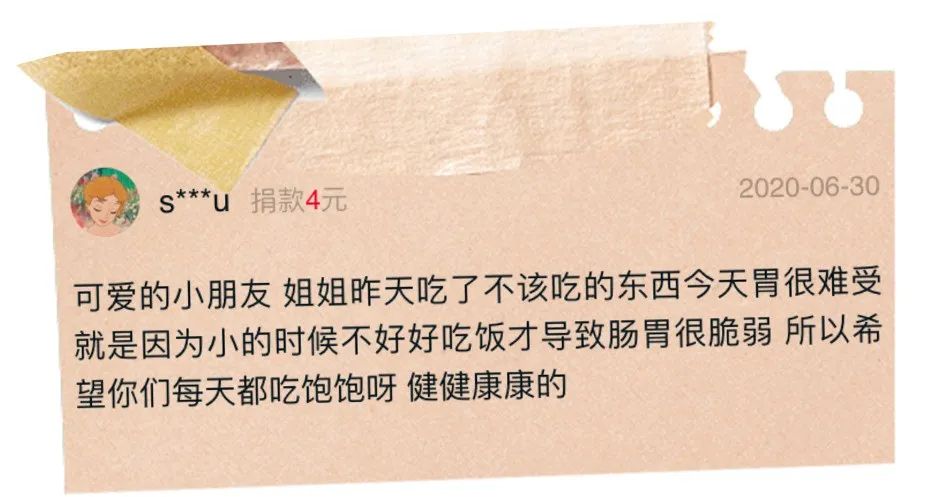 一位身处逆境的捐赠者坦白:“希望行善积德让姐姐未来面对的困扰少一点点”。随后,她又为受捐赠的儿童们留下了衷心祝福,希望他们也能“平安,顺遂,需要面对的困难再少一点······要好好吃饭,好好长大。”