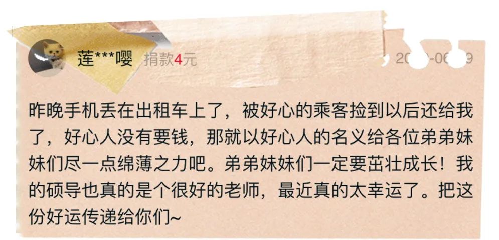 还有好心人送回弄丢的手机,没收下感谢的钱,那就捐给弟弟妹妹们吧。