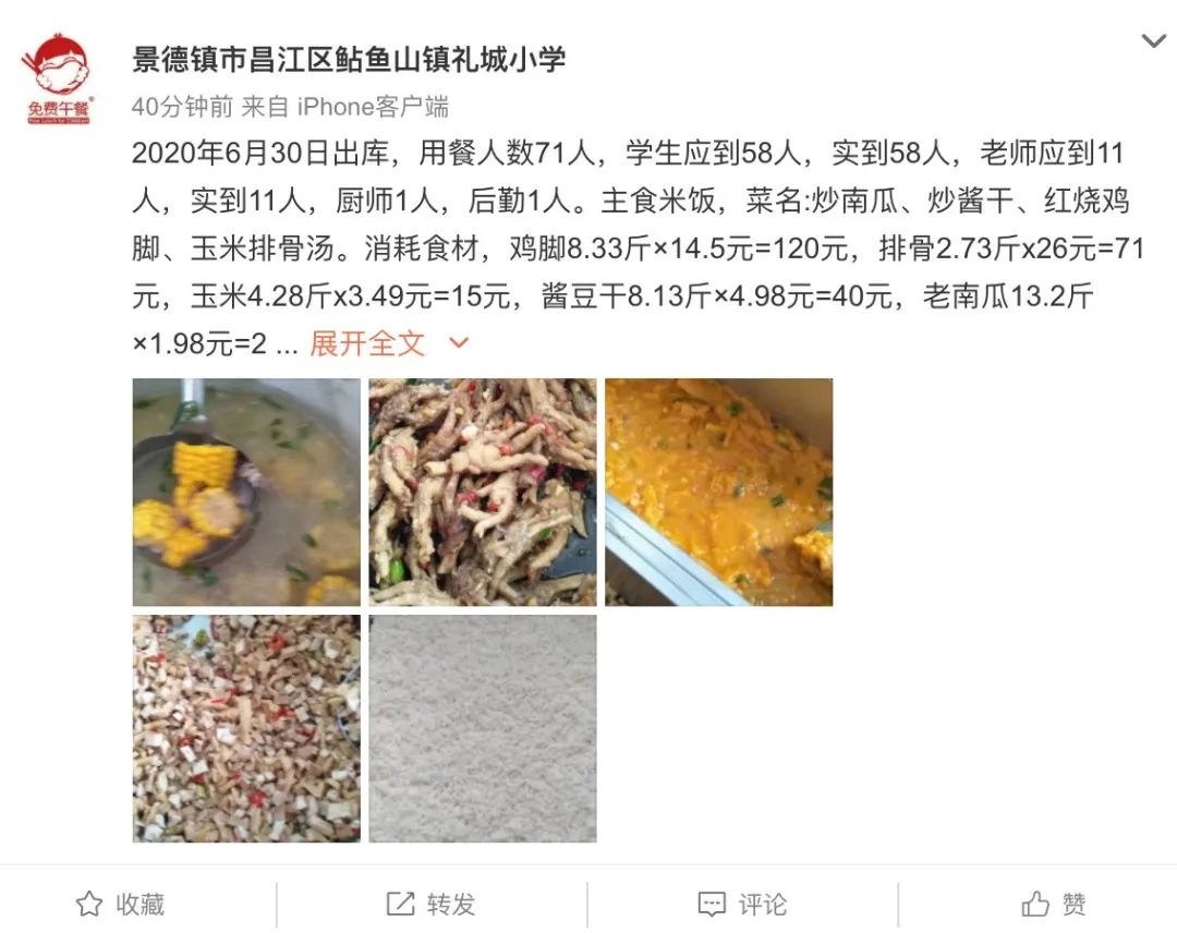 介于之前某些慈善机构的恶习,有人怀疑这钱捐了之后是不是真的会变成山区孩子们的饭菜。院办顺着留言区,在微博找到了不少学校每日定时发的午餐公示。