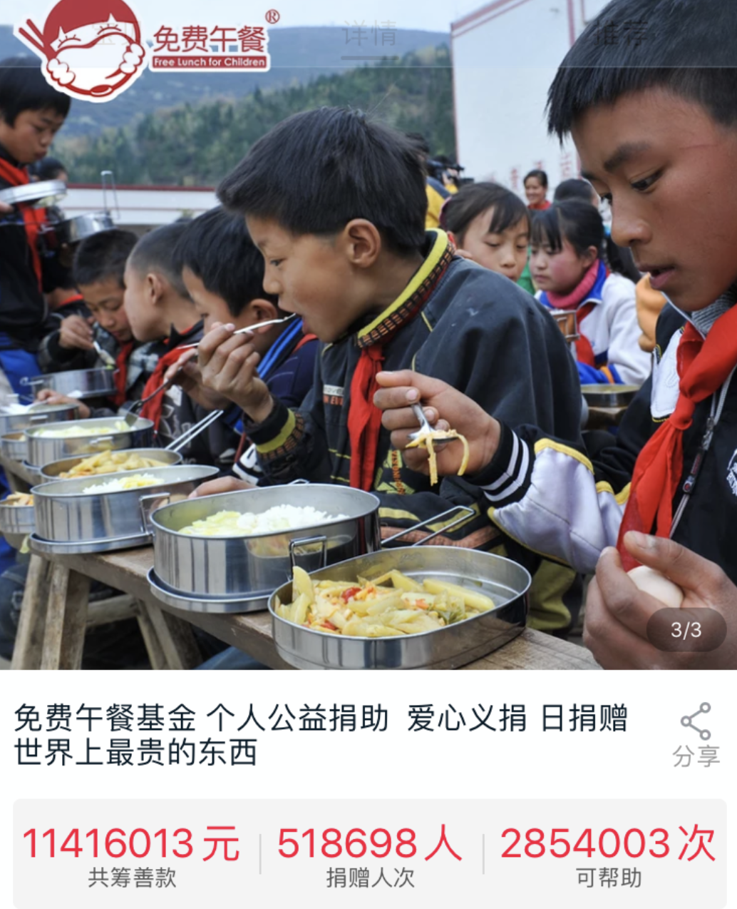 秉承着“省下的都是赚到“生存信条的年轻人们,从生活的犄角旮旯掏出一份份给小朋友们的午餐。有妈妈跟自家小孩一块捐款,会点开免费午餐学校的公示微博,给自家孩子看他捐的零花钱,都变成了贫困地区小朋友们桌上的肉。