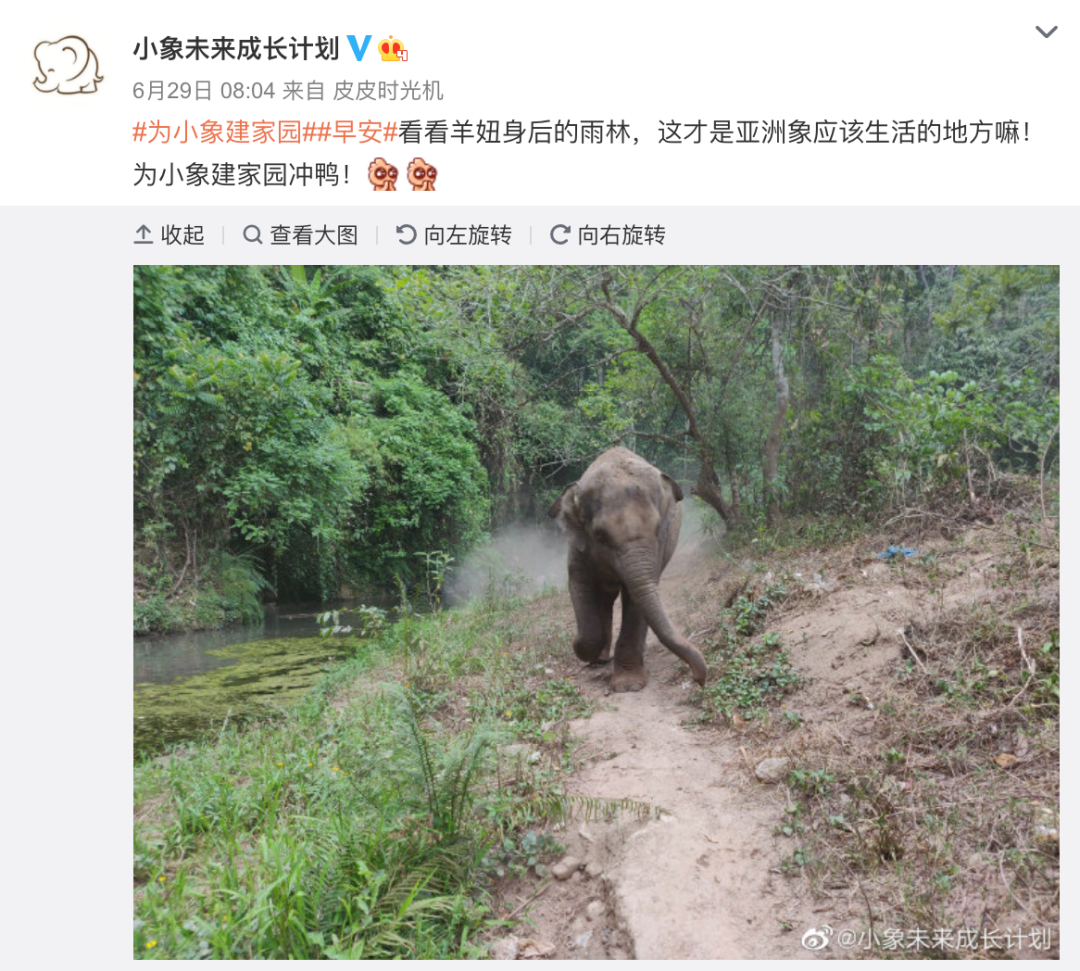 类似的,还有一个名为“小象未来成长计划”的微博账号的评论区。它是云南西双版纳洲热带雨林基金会一个项目的官方微博,致力于改善当地小象们的生存环境,以及喂养治疗一些因各种原因生病的小象。