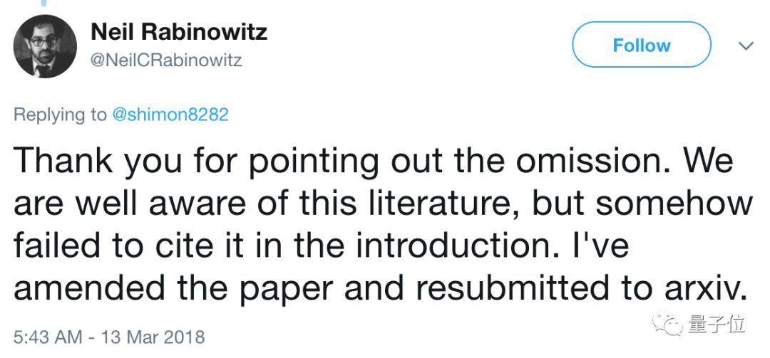 对于“健忘症”这个问题,论文一作、DeepMind研究员Neil Rabinowitz在Twitter上回复说,这些文献他们是知道的,但是在introduction里不知道怎么的就忘了引用了。现在arXiv上更新的第二版论文中,已经加上了这些该引用的文献。