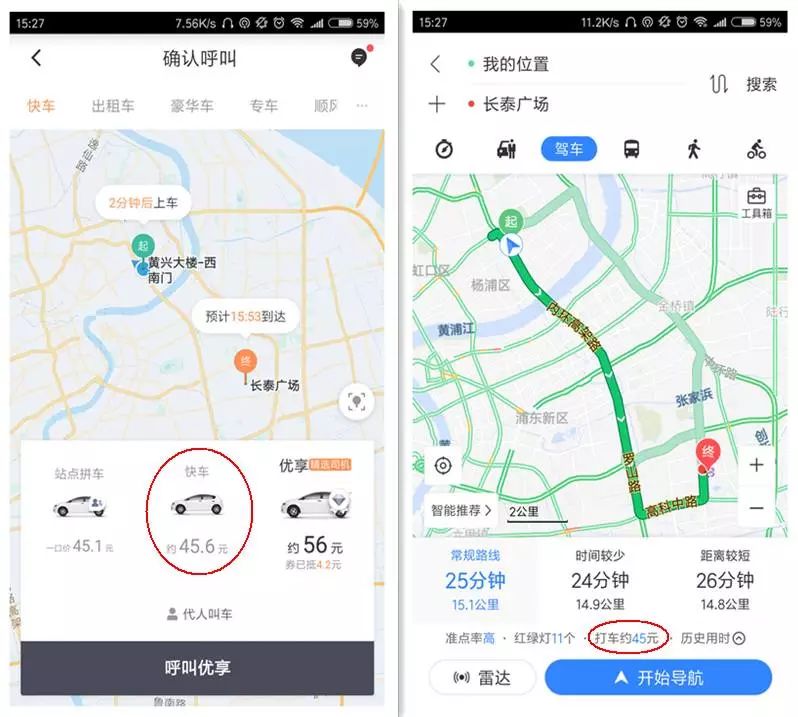 后来,垄断了市场的滴滴结束试用期,大大提高客单价,开始放心研究赚钱的事儿了。如下图所示,现在滴滴打车并不比直接打车便宜。
