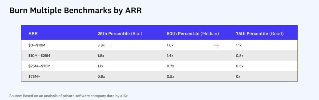 a16z还提出了一个“烧钱倍数”(BM,Burn Multiple)的框架来提醒创业者如何在烧钱增长和赚钱盈利取得平衡。简单来说,就是消耗的现金除以净增ARR(年度经常性收入)的比值。比如消耗了1500万元,产生1000万元ARR,烧钱倍数(BM)就是1.5x。从上表中可以看出,一个好公司价值创造的趋势是,随着公司现金流为正,好公司的烧钱倍数逐步减少,甚至趋近于零。