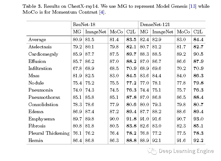 ChestX-ray14数据集上性能的对比。C2L模型性能提升显著。