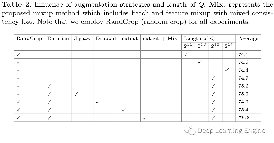 对比数据增强策略和记忆队列Q保存特征长度对性能的影响。