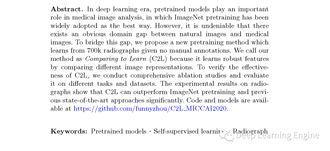 众所周知,医学数据需要该领域专业医师进行标注。这类高质量,多数量的标注数据能够直接提升模型的性能。但医学数据往往因为涉及病人隐私等原因而受到管控和限制,无法获取到大量的带医生诊断结论的数据。那么,开发一种不带标注数据的方法在医学领域就显得尤为重要。一些利用未标注数据进行自监督学习的模型也取得了不错的性能表现,但还无法超过在ImageNet上进行预训练的模型。