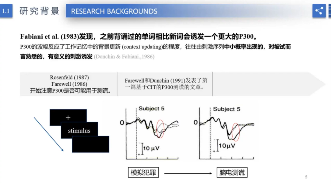 然而目前基于P300的CIT测谎研究仍然存在一些局限。首先,当案件信息泄露的时候,无辜者就知道了犯罪相关的信息,因此就可能会导致误判,会把无辜者判为犯罪者。其次,一些反测谎的手段也可能抵制基于P300的CIT测谎。最后,在真实的犯罪场景中,经常是在比较紧张的环境下进行犯罪行为,犯罪者对犯罪信息的编码并不牢靠,对犯罪信息的很多记忆痕迹并不是很强,由于P300本质就是测再认记忆的,所以可能会导致无法通过这种方式鉴别出他到底是不是犯罪者。