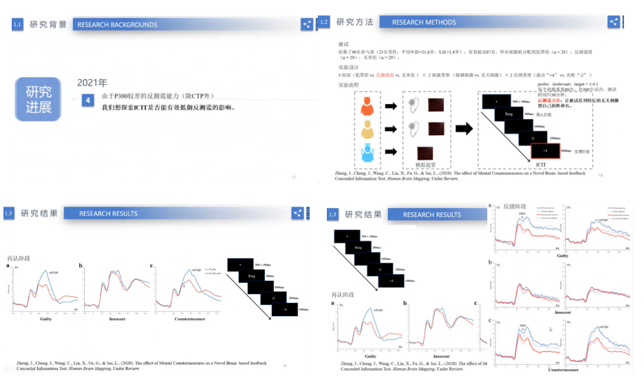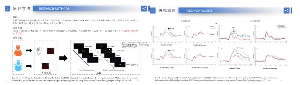 准确地探测谎言对国家安全和司法审判都具有非常重要的意义。自20世纪80年代以来研究者开始探索基于脑电的隐藏信息测试方法,以往大部分的研究主要关注的是与犯罪信息再认相关的P300。自2014年以来,赛博士团队致力探索反馈相关的脑电成分应用测谎的可能性,并在此基础上提出采用再认与反馈相结合的方法联合测谎。本报告主要介绍反馈隐藏信息范式相关的系列研究以及对虚假身份的初探研究。