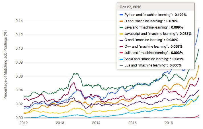 举一个简单的例子,在机器学习领域,python位于最受欢迎的编程语言第一位,遥遥领先。也因为 AI 方向日益火热,python 岗位的薪水水涨船高。
