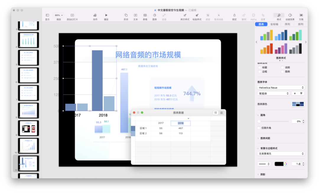 如果数据是自己手动总结,还未作图,则可以通过 Keynote 自带的图表功能加以编辑,然后再对照描摹,重复上述过程。