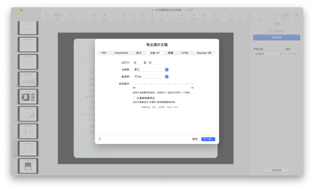 另一个是 Keynote 自带的影片或动画 GIF 导出功能。影片导出设置繁杂,我不推荐。如果导出 GIF,还需注意分辨率和帧率。一般来说,Keynote 自带的 GIF 导出的文件过于庞大,我会选择使用如 Gifski 等软件进行二次压缩。