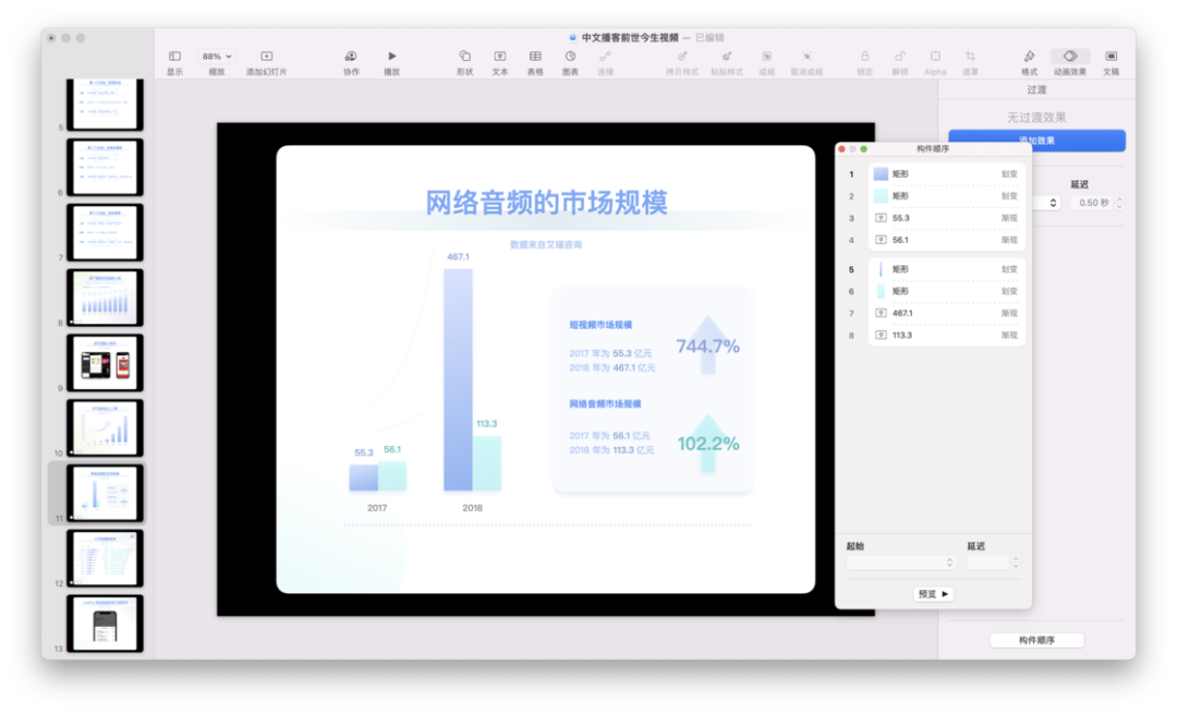 再来讲讲数据动画的部分。文章写作的配图一般不太需要制作动画,只有讲演和视频时才会动画来锦上添花。
