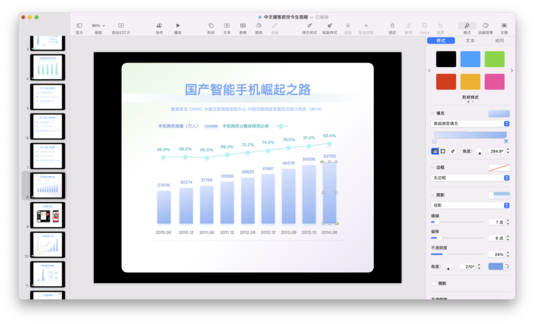 同时,我也认为,作为同一篇文章的配图,既然数据来源不同,各份报告的设计不一致,那么作者也就有统一视觉效果的责任。这就给文章配图增加了不少工作量,而相比 PS 等传统制图工具,Keynote 灵活简单,要修改文件中的数据也很方便,更是可以直接制作动画,比以往的从 AI、PS 到 AE 的制作流程方便太多,虽说 Adobe 的这一套软件功能更强,不论是图片中的如阴影等平面效果里的可调节参数、还是动画的速度曲线、表达式等详尽功能,都丰富极多,但 Keynote 更新这么多年,做个数据图还是够用的,眼下又是扁平化设计的时代,太多复杂元素反而让人觉得不够灵动。