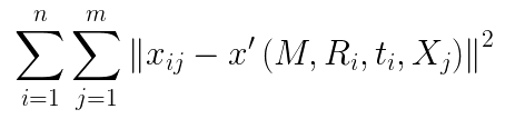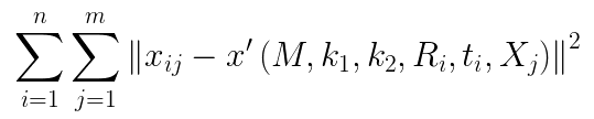 现在我们来考虑透镜畸变的影响,由于径向畸变的影响相对较明显,所以主要考虑径向畸变参数,根据经验,通常只考虑径向畸变的前两个参数k1,k2就可以(增加更多的参数会使得模型变的复杂且不稳定)。实际求解中,通常把k1,k2也作为参数加入上述函数一起进行优化,待优化函数如下所示