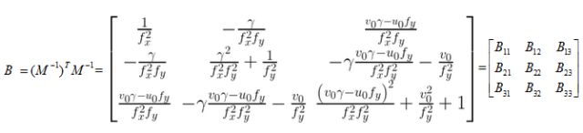 根据n张不同角度的标定图片,最终我们得到了一个矩阵集合 Vb=0 ,其中V是一个 (2n x 6) 的矩阵。如果 n>=3,就可以得到唯一解b(带有一个比例因子)。