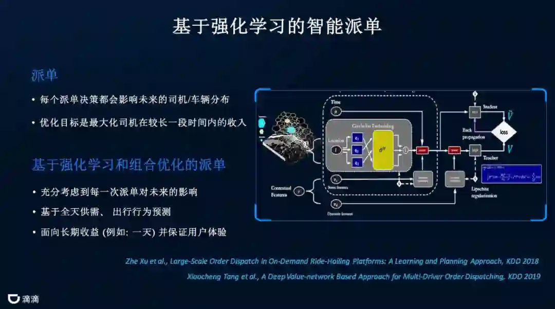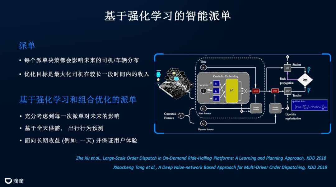 分单是滴滴的核心引擎,早期滴滴是在2秒内做1次全局最优派单,目标是2秒以内的效率提升,使更多的用户可以被应答。2016年AlphaGo出现以后,滴滴便借用强化学习技术,目标从2秒最优变成1天以内的整体效率最优,在确保乘客出行体验的基础上,极大地提升了司机的效率。