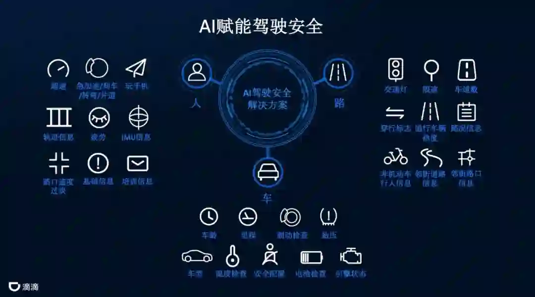 滴滴一直致力于用科技提升出行安全,主要考虑三个维度:人、车、路。人就是驾驶员信息,包括IMU信息、轨迹信息、超速、疲劳等。路包括道路基础设施,车道线等。车就是车龄、车型、车胎等。