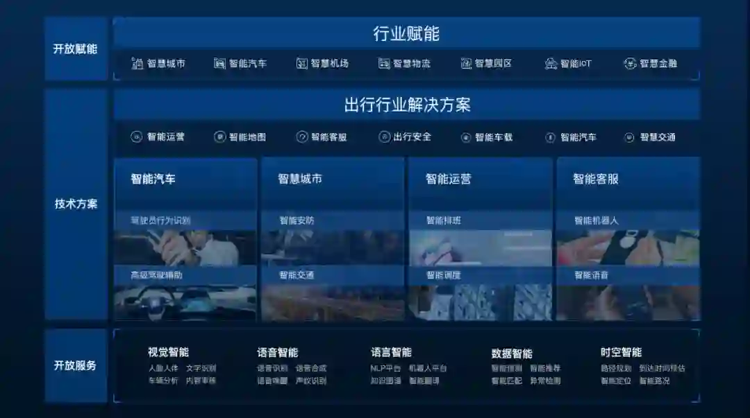 峰会上,叶杰平发布了滴滴AI开放平台,该平台共分三层,目前已集中开放视觉智能、语音智能、语言智能、数据智能、时空智能五大AI领域技术服务,并推出智能汽车、智能运营、智能客服、智慧城市四大AI行业解决方案。