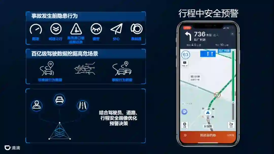 叶杰平说:“比如在出行安全方面,我们应用大数据、AI技术挖掘交通事故常发生的地点,识别多种不良驾驶行为,如行驶速度过快、通行路口不减速等,然后在这些数据的基础上,通过机器学习、数据挖掘等方法建立人、道路、路口等的安全画像,进而对司机播报预警,例如针对前方交叉路口等相对危险的地带提前提醒司机注意驾驶安全。”