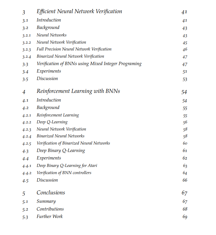 与传统软件不同的是,人类几乎不可能理解神经网络实现的逻辑,这使得它们成为不透明的模型,并可能阻止它们在安全或关键任务应用中使用。在很多情况下,仅仅运行模拟还不足以让人们对它们建立信心,因为一个故障就可能导致灾难性的后果。本文的工作解决了在具有神经网络组件的机器学习系统中建立信任的挑战。我们首先介绍神经网络验证,这是一种验证网络是否具有所需属性的过程。我们介绍了神经网络验证的最新进展,包括我们自己的贡献,并表明,尽管取得了进展,验证仍然是一个非常具有挑战性的问题,目前的算法难以扩展到大型网络。然后,我们提出了一种可选的方法,该方法将验证需求合并到模型的设计中。更简单的模型更容易验证,我们证明了一些问题可以用二值化神经网络(BNNs)解决,明显更简单的模型,参数可以用1位表示,具有与全精度模型相似的性能。我们提出并演示了一种简单的混合整数规划方法来验证它们,并表明该方法具有良好的可扩展性。最后,我们提出了一种深度强化学习算法,类似于使用BNN作为函数逼近器的深度Q学习算法。我们再次表明,这种方法能够牺牲少量性能,并获得可扩展的验证。