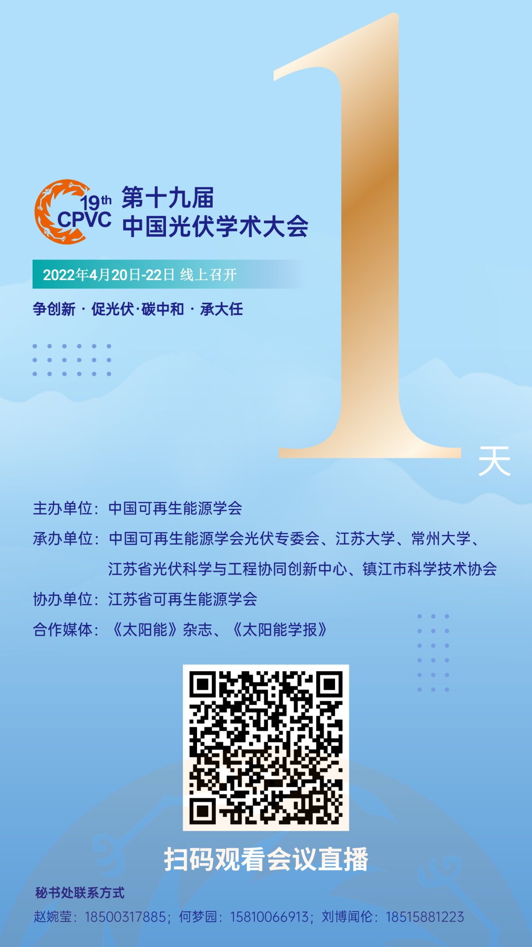 第十九届中国光伏学术大会(CPVC19)将于2022年4月20日-4月22日以全线上的形式召开。届时,请各位观众扫描二维码或复制会议直播网址观看。在此,我们诚挚地邀请太阳能光伏及相关领域内的专家、学者、教师、学生及工程技术人员踊跃参会。