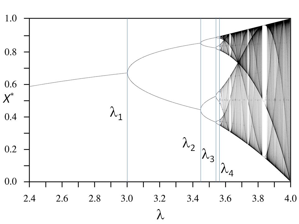 随后,费根鲍姆继续调整参数b,让b继续增大。当b增加到了一定程度,周期会从2变成4。继续增加b,周期又会相继变为8与16……这个现象叫做倍周期分叉。