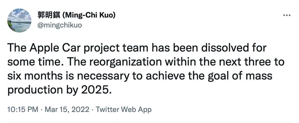 3月15号,天风国际证券分析师郭明錤在Twitter上爆出猛料:苹果汽车团队已经解散了一段时间。如果想要2025年量产汽车,那么苹果需要在3~6个月内重组团队。