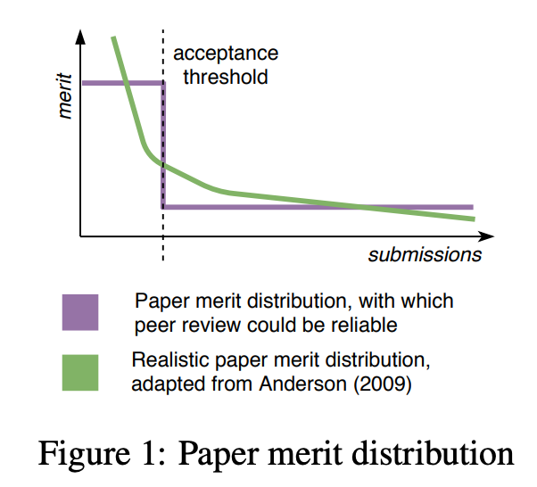 如果论文评分分布在优秀论文和糟糕论文之间有一道明确的界限,那同行评审就很简单了。但是,很显然事实并非如此。基于引用数,Anderson (2009) 假设论文评分符合 Zipf 分布,如图 1 所示。这意味着即使对于最客观的评审者,接收论文中最差的和被拒论文中最好的差异也不到 1%。