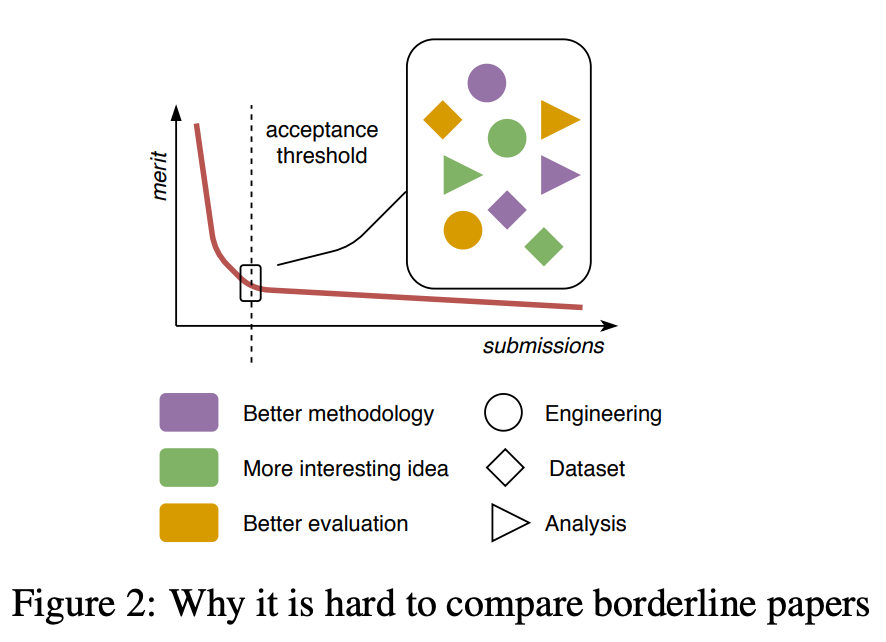 更糟糕的是,并不存在清晰的标准帮助评审人员绘制决策边界。Anderson (2009) 讨论了 SIG-COMM 2006 的一次实验,他们首先对低评分方差的论文给出接收 / 拒绝的决定,然后将高方差的论文分配给 9 位额外的评审人员。评审者不得不讨论难以决定的论文,据报道他们快被这种无法拿来对比的事情逼疯了,如这篇处在被拒边缘的论文缺乏完备的评估,另一篇应用范围较窄。不管我们思考多久,决策结果看起来都是随机的。例如:NIPS 2014 上,两位不同的 PC 对其中 10% 的提交论文进行评审,结果 57% 的论文接收决策是不一致的。