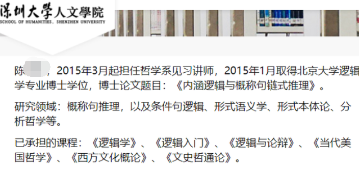根据深圳大学人文学院教师简介,教师陈某某毕业于北京大学,获得逻辑学专业博士学位;毕业后即进入深圳大学任教,担任哲学系见习讲师,主授《逻辑学》《逻辑入门》《当代美国哲学》等课程。