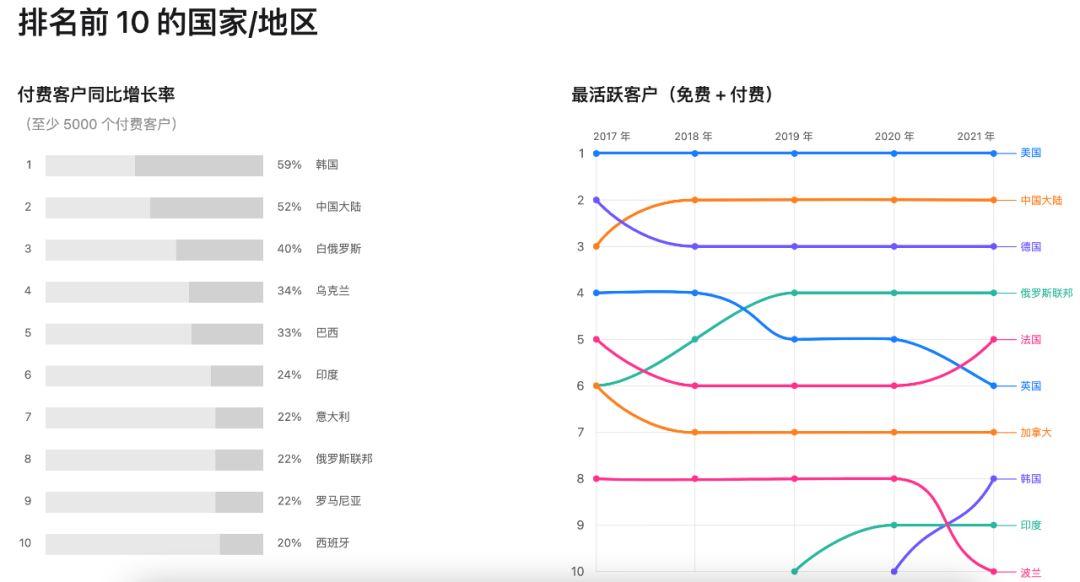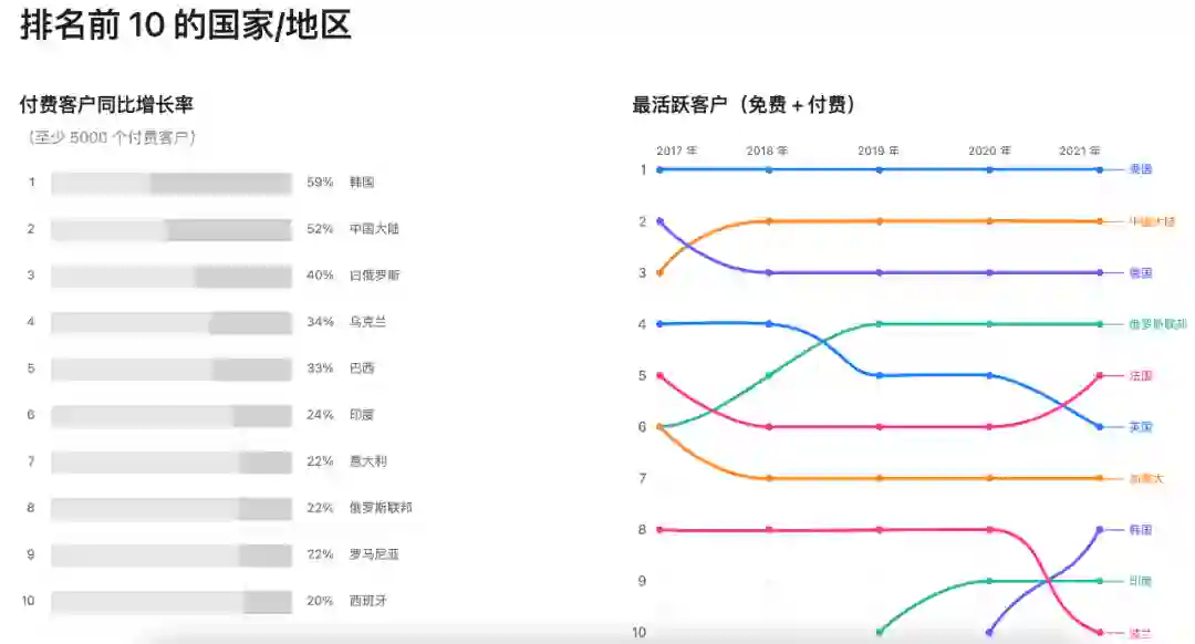 在另外几项数据中,国内也是走在前列。以付费用户为例,自 18 年起,国内就一直处于付费用户第二的位置,去年在付费客户增长率上也是第二位。