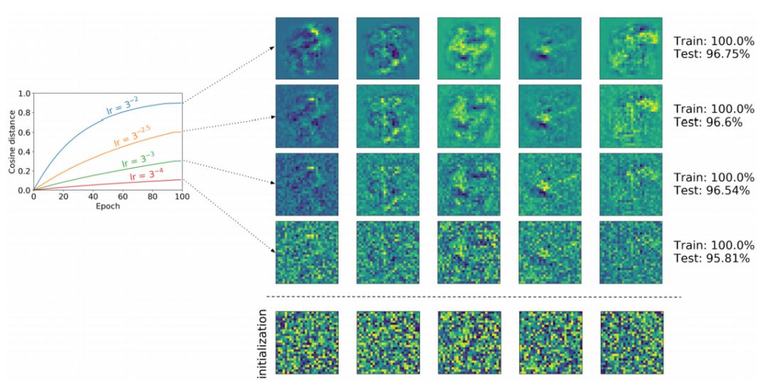 实际上,研究者通过一系列实验(使用不同的数据集、网络和训练过程)表明了,层旋转更大时(即每一层最终的权值和初始权值之间的余弦距离更大),同时泛化能力也会更好。