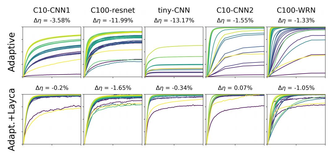 图 6:使用自适应梯度方法(每个任务/列分别使用 RMSProp,Adam,Adagrad,RMSProp+L2 和 Adam+L2),生成的层旋转曲线和相应的测试准确率,第一行不使用 Layca 控制层旋转,第二行使用了 Layca 控制层旋转。
