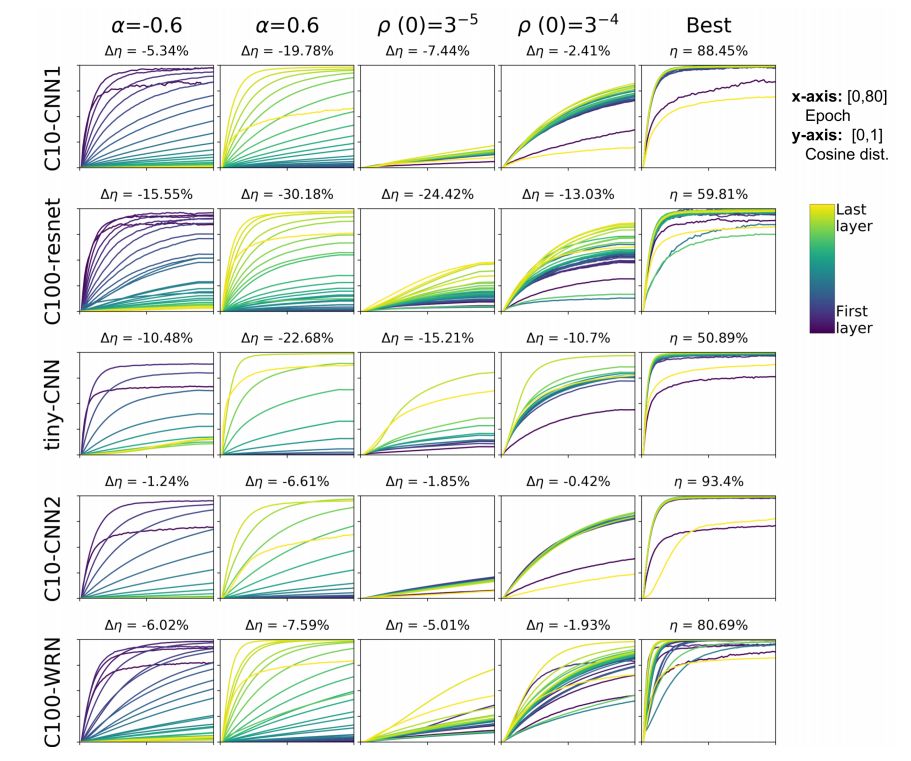 有趣的是,这种关系证明了一种与网络无关的最优状态:在训练过程中,所有层的权值从它们的初始状态变化到余弦值等于 1 时,性能总能优于其它的配置情况,其测试准确率要高出百分之 30%。此外,我们说明了层旋转非常易于检测和控制,有助于超参数调优)。层旋转还能提供统一的框架,从而解释学习率调优、权值衰减、学习率预热和自适应梯度方法对泛化和训练速度的影响。