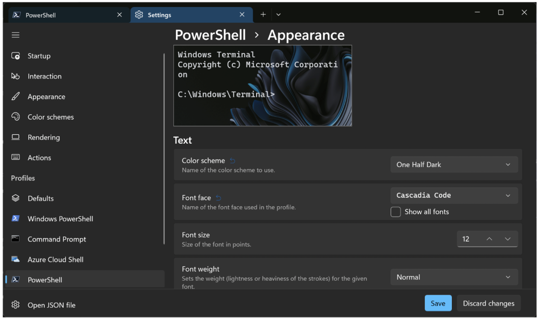 除了以上,Windows Terminal 还提供了大量的自定义选项。最受欢迎的是针对配置文件的选项,包括启动的可执行文件、起始目录、配置文件图标、自定义背景图像、颜色方案、字体和透明度。