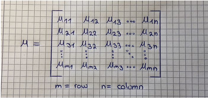 矩阵是一个有序的二维数组,有两个索引。第一个索引表示行,第二个索引表示列。例如,M_23 表示的是第二行、第三列的元素,在上面淡黄色的图中是 8。矩阵可以有多个行或者列,注意一个向量也是一个矩阵,但仅有一行或者一列。