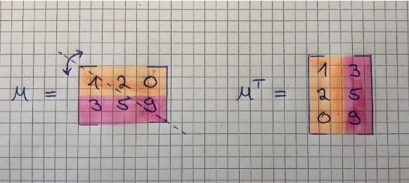 最后,我们讨论矩阵转置的性质。这基本上就是将一个矩阵沿着 45 度轴线镜像翻转。计算矩阵的转置非常简单,原始矩阵的第一列就是转置后矩阵的第一行,第二列则变成了转置后矩阵的第二行。一个 m×n 的矩阵仅仅是转成了 n×m 的矩阵。同时,矩阵 A 的元素 A_ij 等于转置后矩阵的元素 A_ji。下图展示了矩阵的转置: