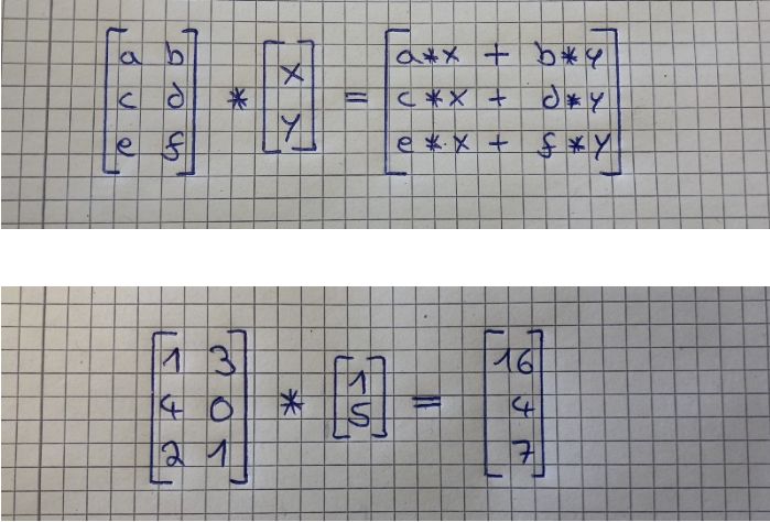 为了更好地理解这个概念,我们详细讲解一下第二张图中的计算步骤。为了得到结果向量中的第一个元素 16,选择拿来和矩阵相乘的向量中的元素 1 和 5,把它们与矩阵第一行中的元素 1 和 3 相乘,像这样:1*1 + 3*5 = 16。对矩阵第二行的元素进行相同的计算:4*1 + 0*5 = 4。同样,再计算矩阵第三行的元素:2*1 + 1*5 = 7。