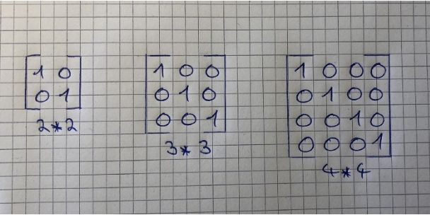 单位矩阵的主对角线元素都是 1,其余元素都是 0,你可以根据这个性质得到一个单位矩阵。同时它也是一个「方阵」,这表示它的行数和列数是相等的。