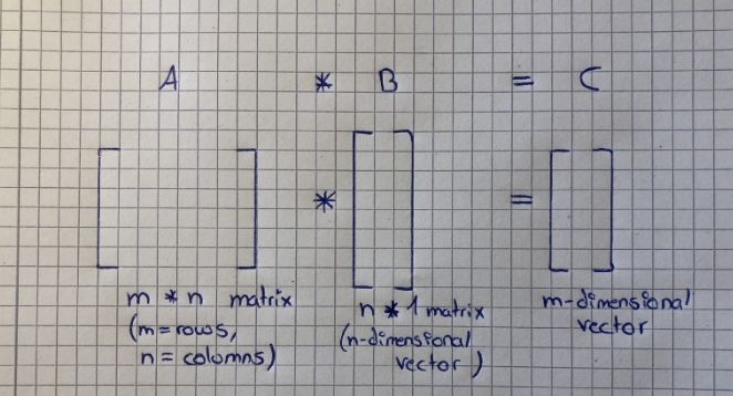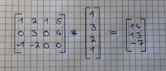 对一个矩阵乘以一个向量,可以理解为对矩阵的每一行乘以向量的每一列,运算结果会是一个向量,它的行数和矩阵的行数一样。下图展示了这是如何计算的。