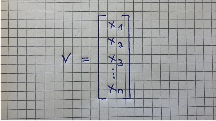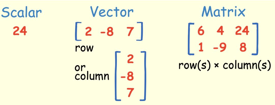 向量是一个有序数组,能够写成一行或者一列的形式。向量只包含一个索引,用来表示向量中的某个特定元素。比如 V_2 表示向量中的第二个元素,在上面淡黄色的图中是-8。