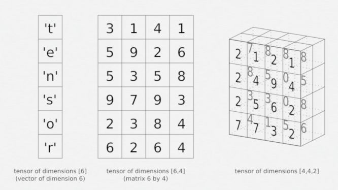 张量是上面谈到的概念中最常用的一个,因为张量是一个多维数组,同时可以是一个向量或者一个矩阵,具体取决于它的索引数量。例如,一阶张量可以表示向量(1 个索引),二阶张量可以表示矩阵(2 个索引),三阶就是张量(3 个索引),更高阶的称为高阶张量(超过 3 个索引)。