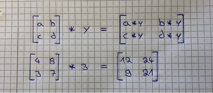 如果你在一个矩阵上加、减、乘、除一个标量,你所做的就是直接对矩阵的每个元素进行这些数学运算。下图给出了矩阵数乘的一个很好的例子。
