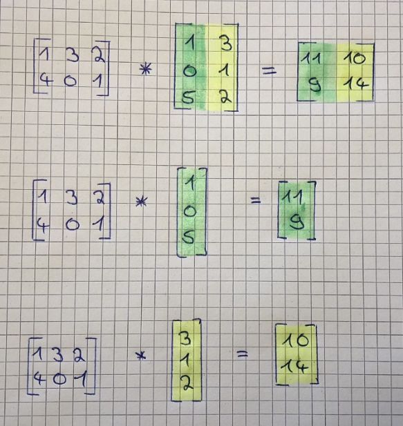 你只需要将第二个矩阵分成列向量,然后分别将第一个矩阵和每个列向量相乘。然后,将运算结果拼接成一个新的矩阵(不要把它们加起来!)。下图逐步展示了计算过程: