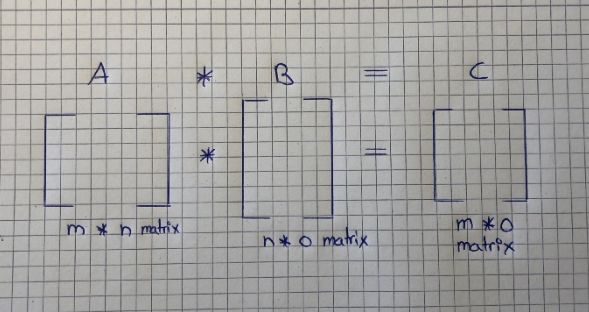 如果你知道如何计算矩阵和向量间的乘法,矩阵间的乘法就也简单了。注意,只有当第一个矩阵的列数和第二个矩阵的行数相等时,才能把它们两个乘起来。运算结果会是一个矩阵,行数和第一个矩阵的行数相等,列数和第二个矩阵的列数相等。计算方法如下: