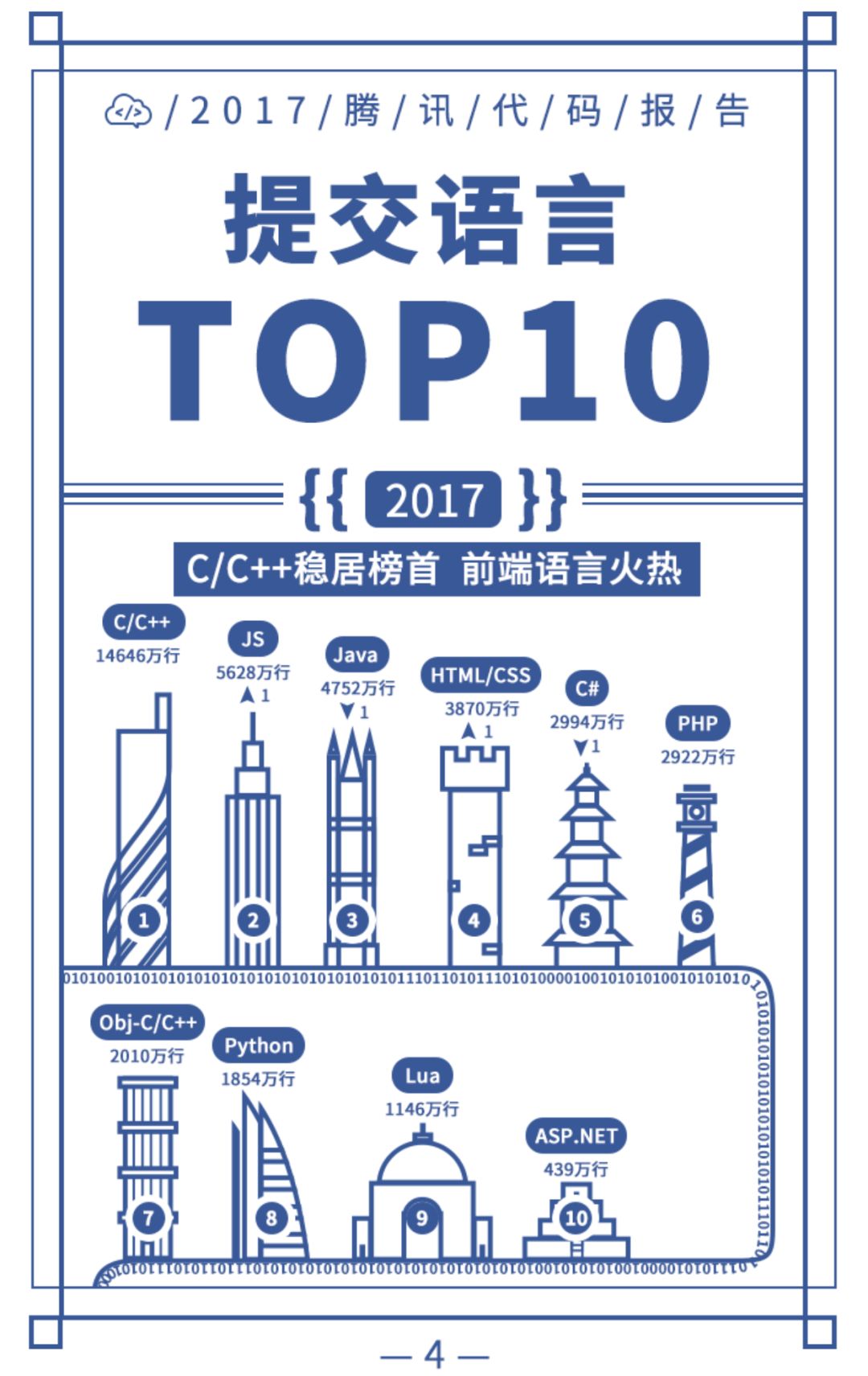 腾讯近日发布了 2017 年度代码报告,对过去一年腾讯的研发数据进行了统计,涵盖代码、开发者、语言等基础数据。据报告所述,截止 2017 年: