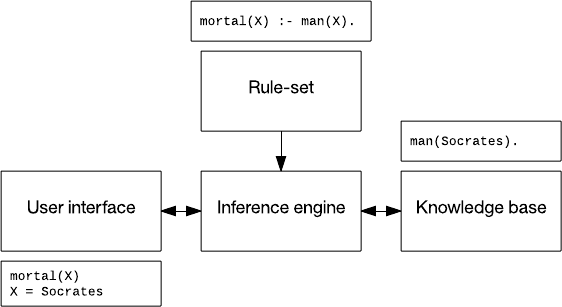 基于规则的系统通常由一个规则集合、一个知识库、一个推理引擎(使用前向或反向规则链)和一个用户接口组成。下图中,我使用了知识「苏格拉底是人」、规则「如果是人,就会死」以及一个交互「谁会死?」
